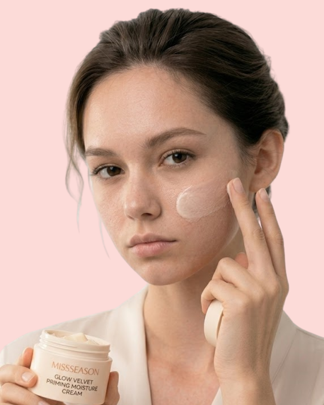 MISS SEASON Glow Velvet Priming Moisture Cream prepara la piel antes del maquillaje para lograr un acabado suave y luminoso.